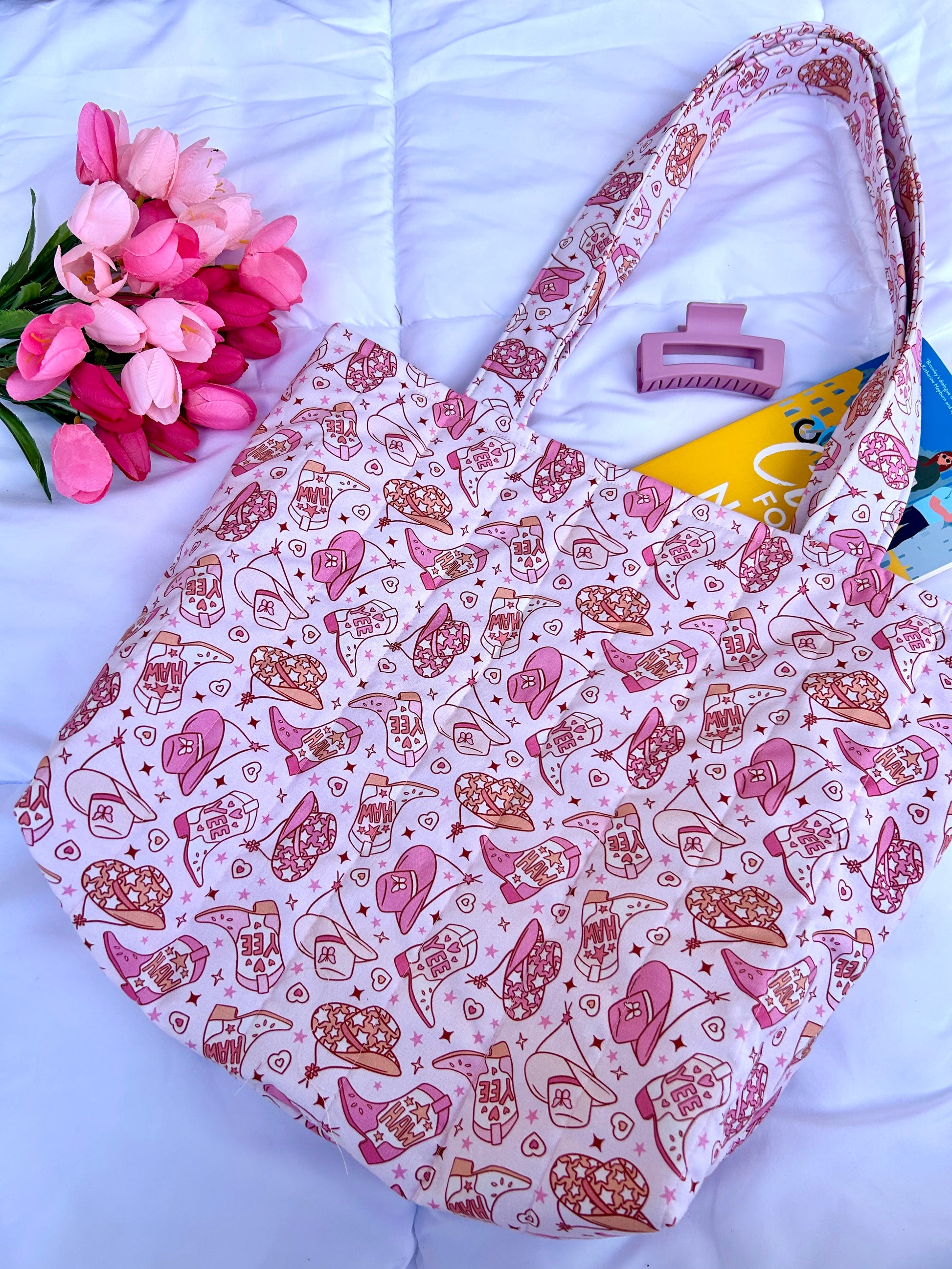 Handcrafted from 100% cotton quilted fabric, this tote bag offers a soft, plush feel while providing protection for your belongings. Designed with both style and function in mind.